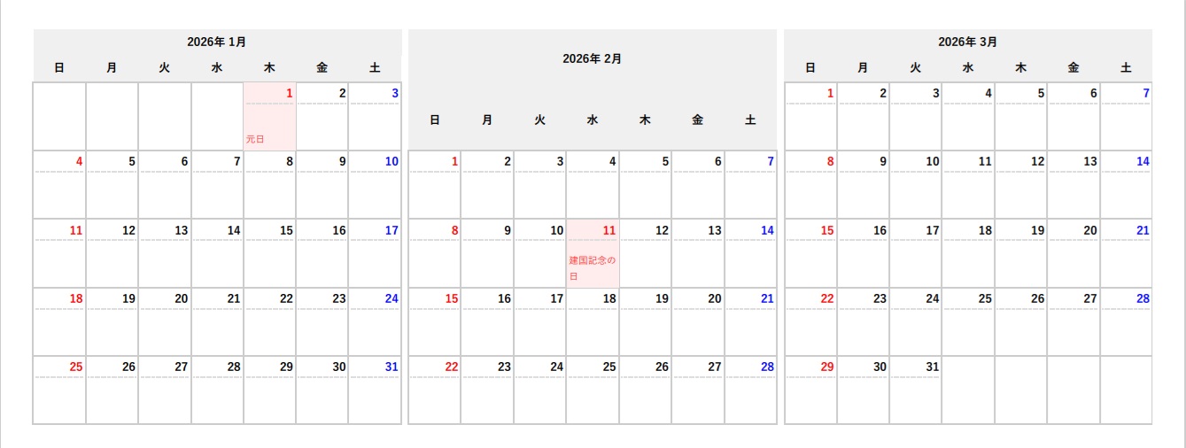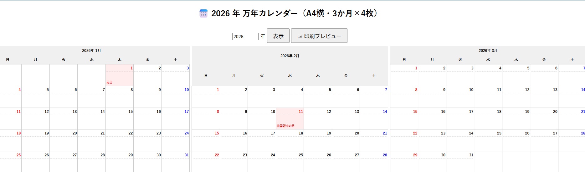となり印刷プリビューで見たところです、この通りA4横×4枚で印刷されます。3カ月毎1月~12月が4枚で印刷されます。